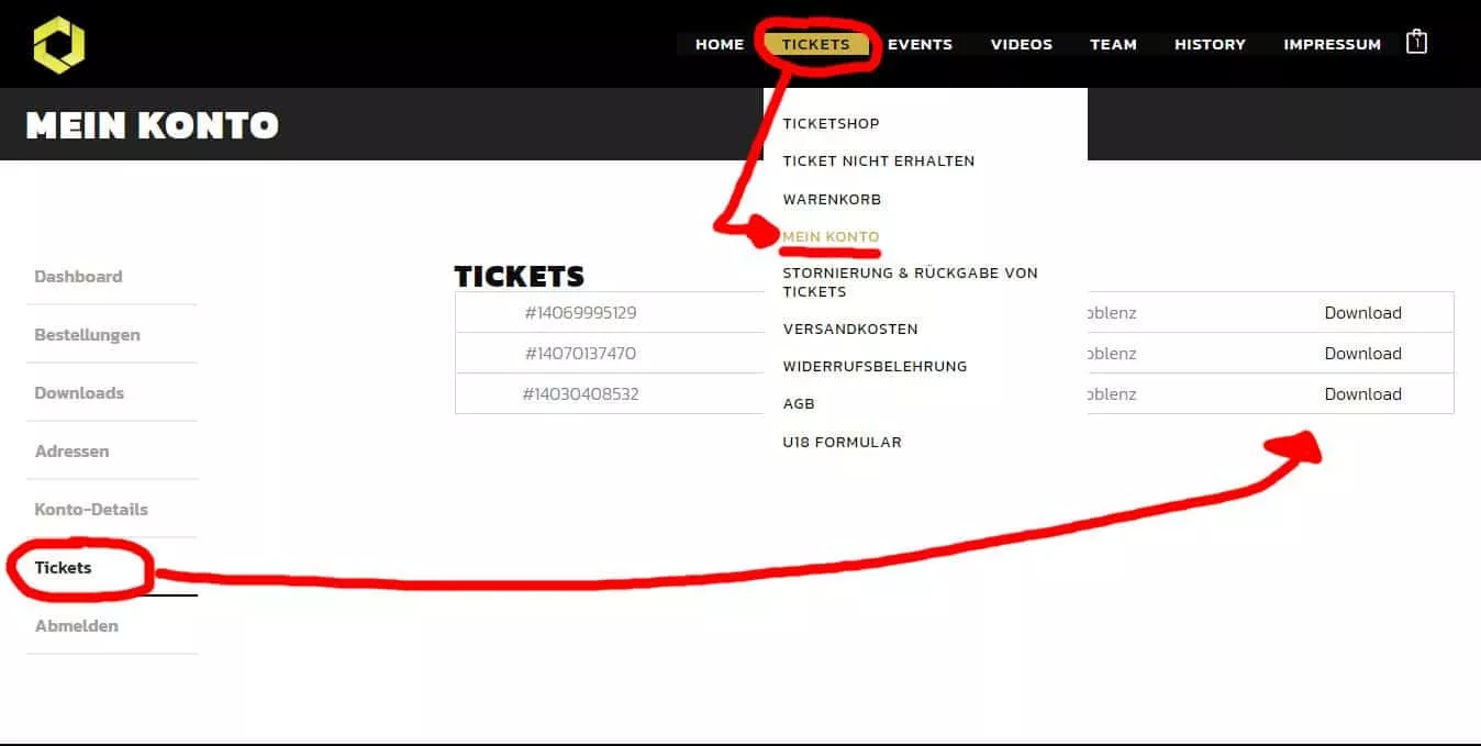 Falls du dei­ne Tickets nach der Bestel­lung und Bezah­lung nicht in dei­nem Post­ein­gang fin­dest, kannst du sie jeder­zeit ganz ein­fach über dei­nen “Mein Kon­to”-Bereich erneut her­un­ter­la­den. Hier fin­dest du alle dei­ne Bestel­lun­gen und kannst dei­ne Tickets direkt als PDF her­un­ter­la­den, wann immer du sie brauchst.